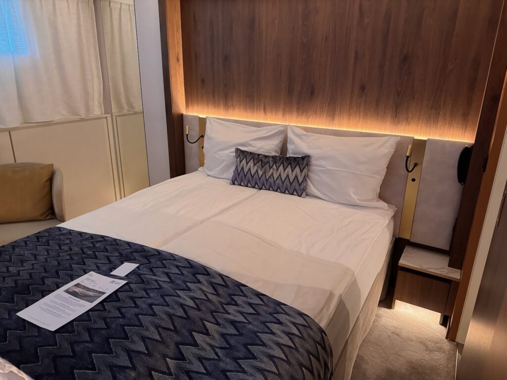 Die 2-Bettkabinen waren trotz 14 Quadratmetern geräumig und sehr modern eingerichtet. Wie ein Blick aus den kleinen oben liegenden Fenstern verriet, lag man damit auch teilweise unter dem Wasserspiegel. Die meisten Passagier-Kabinen befinden sich auf dem Mittel- und Oberdeck, sind zwei Quadratmeter grösser und verfügen über Panorama-Fenster.